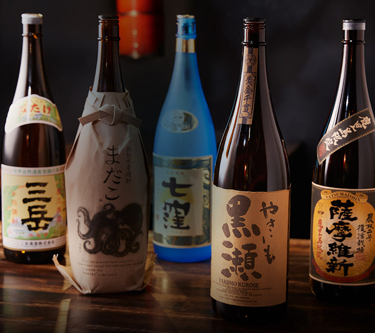 当店は、信頼の置ける九州の酒屋さんとお付き合いがあるため、九州産の芋焼酎が豊富に揃います。そのため、定番の銘柄はもちろん、普段なかなかお目にかかれないようなプレミアム焼酎もご用意。常時130種類もの品揃えを実現しています。たくさん飲み比べて、お気に入りの味わいを見つけてみてください。